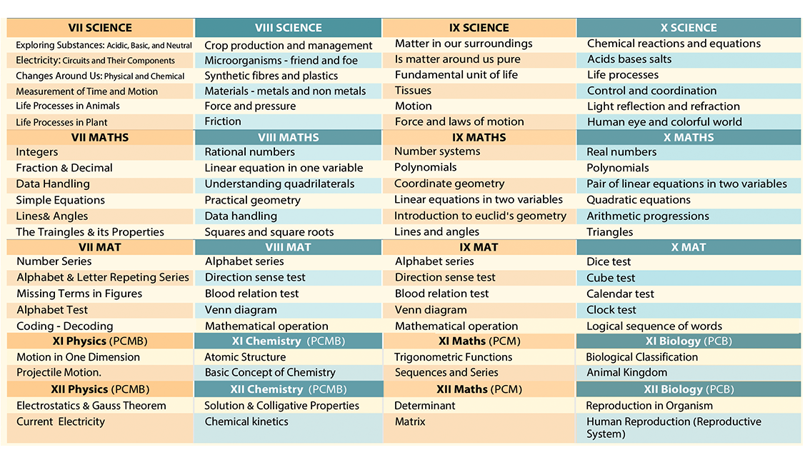 | Class 7th to 10th | Science | 24 Ques (Phy:8, Chem:8, Bio:8) Duration | 1 Hour | |